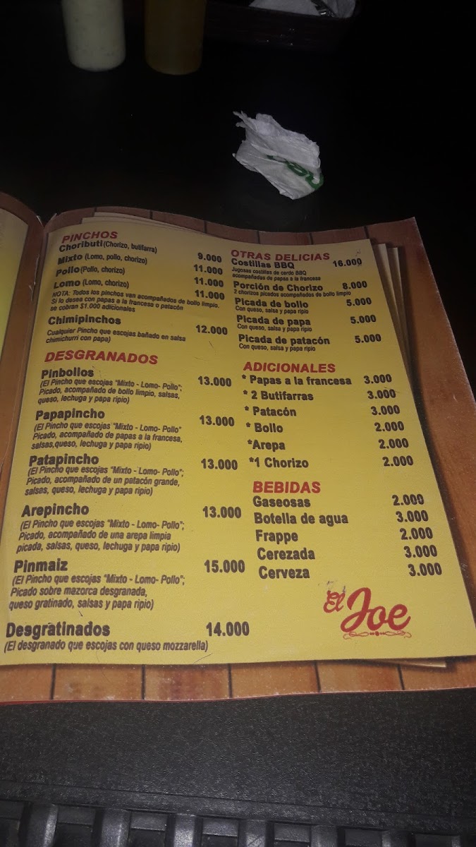 The ambiance is enjoyable, with separate areas for formal and informal dining processes. Although parking can be a challenge, the warm service and vibrant atmosphere compensate for it. Whether you're stopping by for a quick bite or a relaxed dinner, Joe Pinchos y Desgranados promises an excellent culinary experience that celebrates the rich flavors of Colombian cuisine.